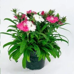 Dianthus Sugar n’ Spice is an herbaceous perennial offering 4 seasons of interest. Blooming continually from spring to fall, this evergreen plant sets masses of huge, highly serrated blooms. The fringy flowers put on a spectacular tri-color show. Borne in clusters of 3 to 4 and held aloft lush foliage on sturdy stems, the flirty, spice-scented flowers attract bees and butterflies to the garden and make excellent, long-lasting additions to fresh floral bouquets.