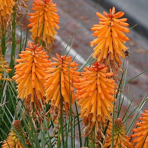 Bred for short, grassy leaves and a compact, clumping habit, Kniphofia ‘Poco Orange’ stands out in any environment with its bright orange flowers with blazing red tips beaming through green foliage. Outstanding as a color spot, in mass plantings, or as a vertical accent at the front of borders, it grows quickly in the spring before flowering in July. Several inches shorter than Mango Popsicle, a Kniphofia with similar bright orange flower spikes, it grows to less than 2 feet at maximum height.