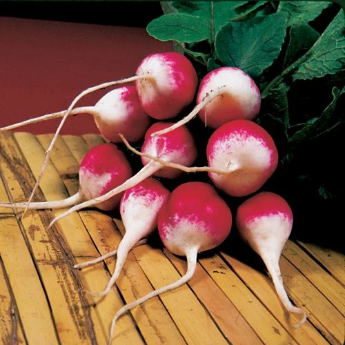 Ready in just a little over 3 weeks, this knobby little radish is full of character but easy on spice. Even children have been known to smile at its appearance. Every fruit is distinctive—this isn’t one of those vegetables that looks like it came from a designer’s studio instead of a friendly vegetable patch. The shading from brightest scarlet to pure white is dotted with merry flecks, and the size of the fruit ranges from 1 to 1½ inches, with a wide, long white root trailing from the end.
