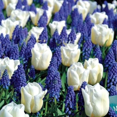 Here’s a duo that every sunny spring garden can use: fragrant, eager-to-naturalize Muscari (Grape Hyacinth) combined with creamy white species Tulip! Well matched in bloom time and height, Tulip Muscari Mix creatse a swathe of blue and ivory cream that looks almost magical in the early season garden or your best containers!